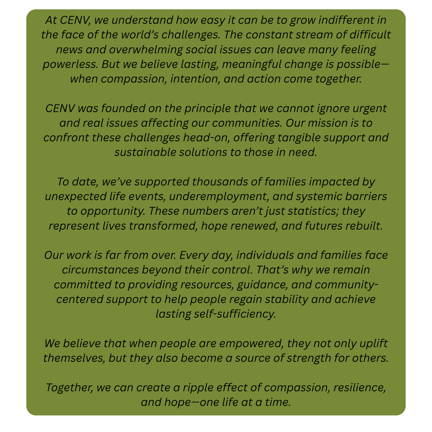 Community Empowerment Northern Virginia (CENV) is a non-profit organization that is dedicated to strengthening communities and empowering those in need. Our founder, Ms. Phan, has a background in social work and has worked in the DMV area for two decades, compassionately offering aid to those who need it. She leads a team of dedicated professionals who are committed to helping others by developing skills and providing resources.